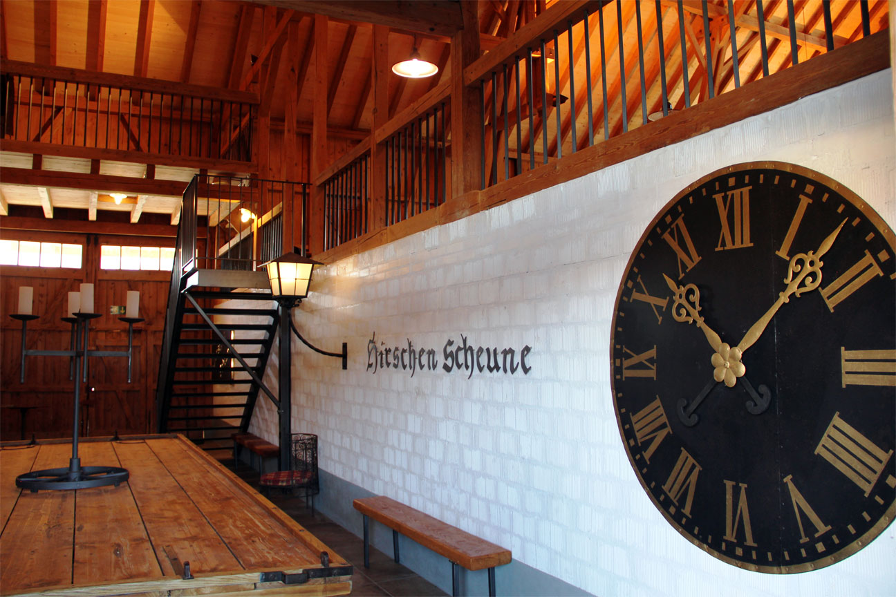Die Hochzeitsscheune Festscheune erzählt ihre ganz eigene Geschichte – mit liebevollen Details, die jeder Feier eine persönliche und beinahe magische Note verleihen. Dabei setzen kunstvolle Skulpturen stilvolle Akzente, während im Dachstuhl eine schöne kleine Kirchenglocke hängt, die per Handseilzug geläutet werden darf – ein besonderer Moment, der grosse Wirkung entfaltet. Gerade zur Einleitung einer Präsentation wirkt dies sehr originell. Wenn die Hochzeitsglocke läutet, herrscht Freude! Zudem wacht an der Ostwand unsere imposante, zwei Meter grosse Kirchenuhr – ein echter Blickfang, der jedem Anlass noch dazu einen Hauch von Besonderheit verleiht