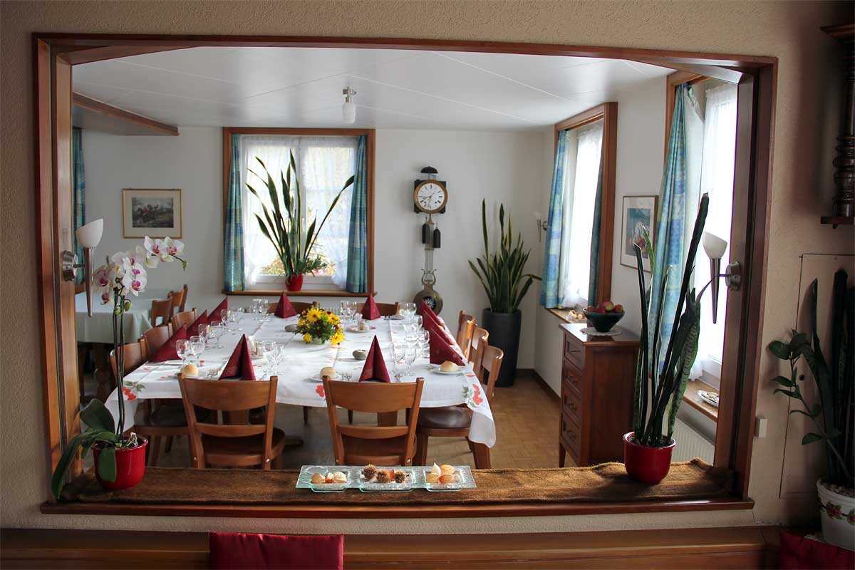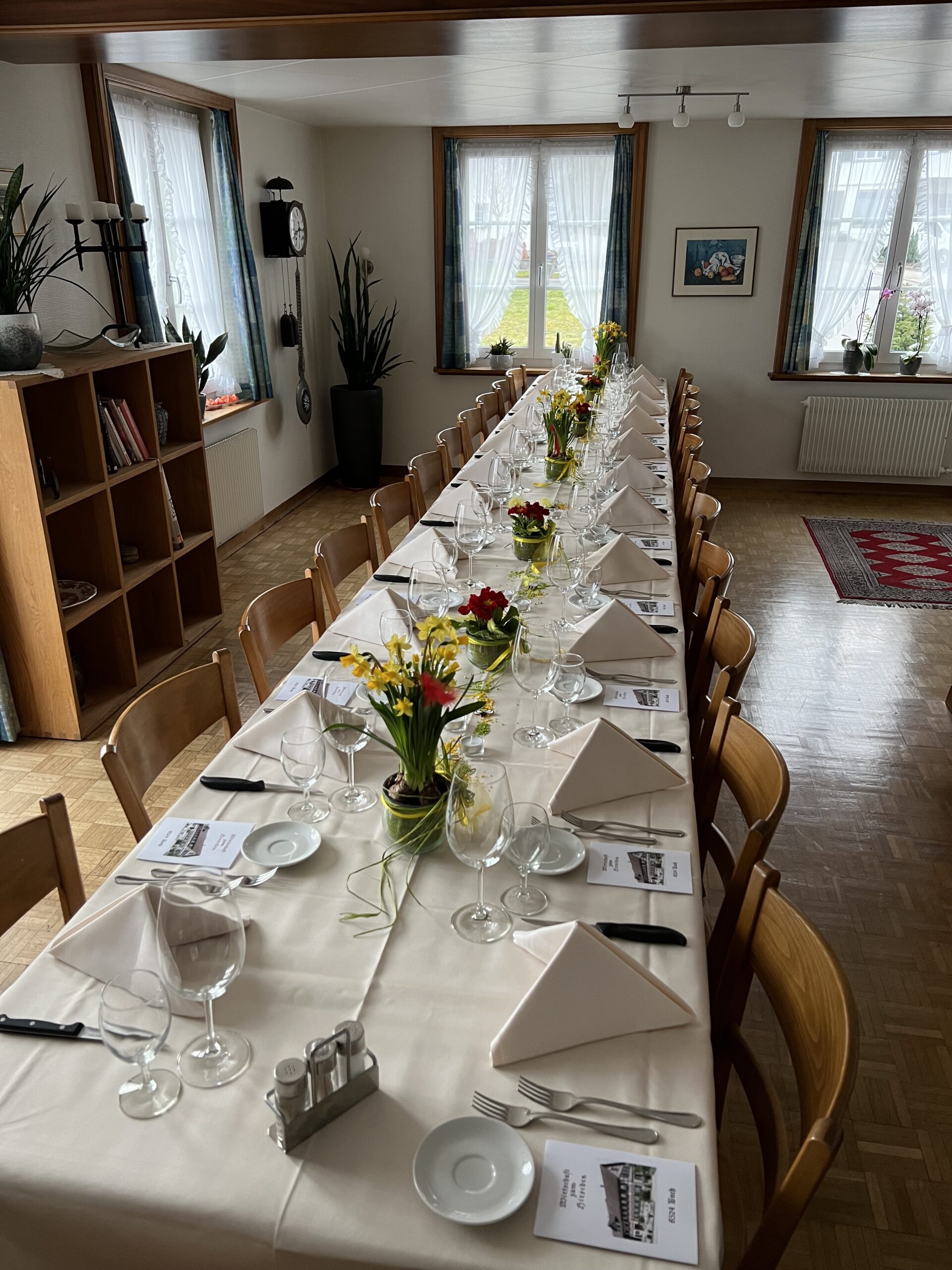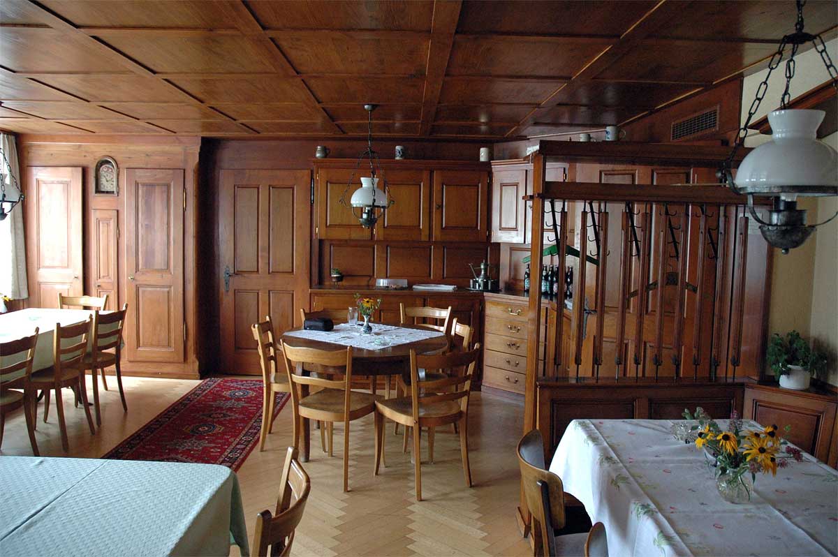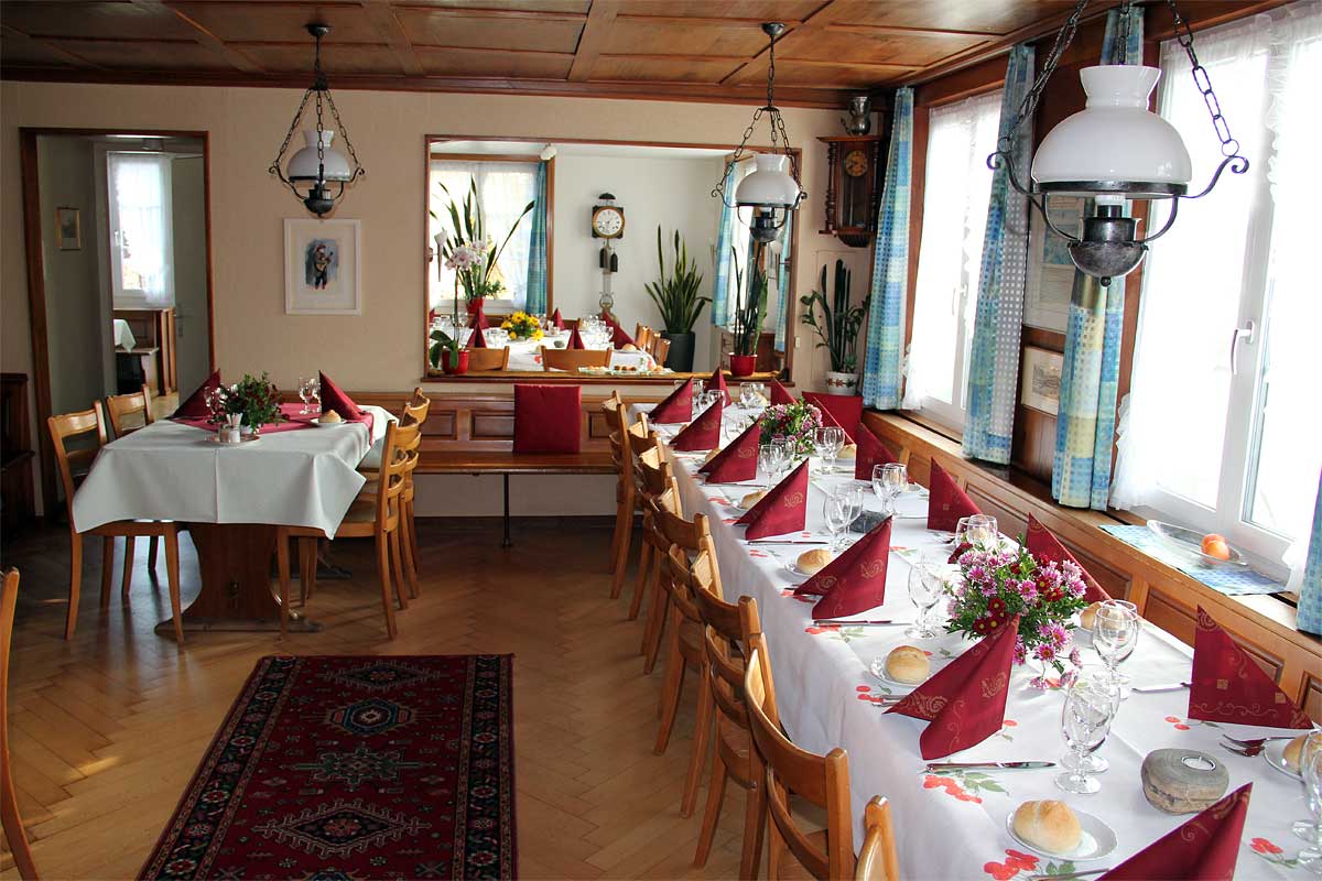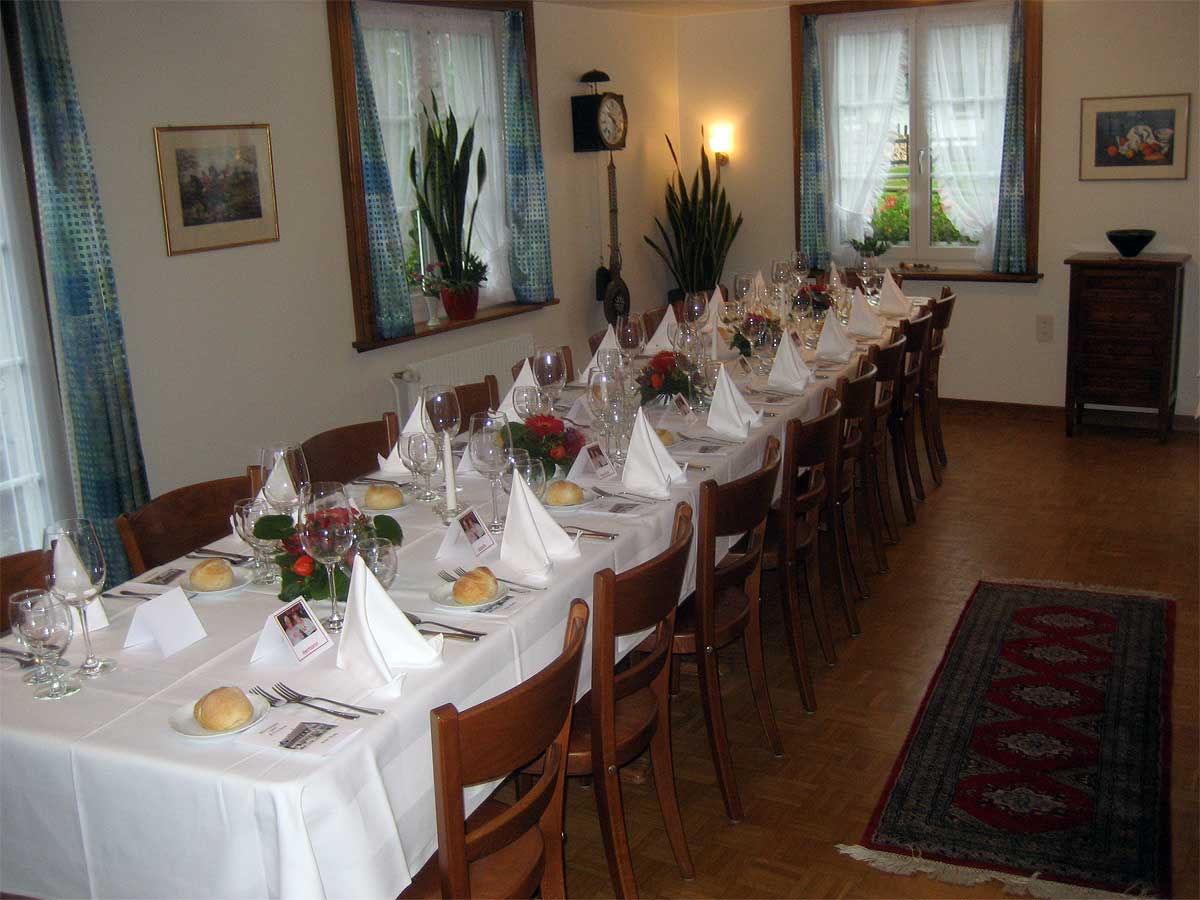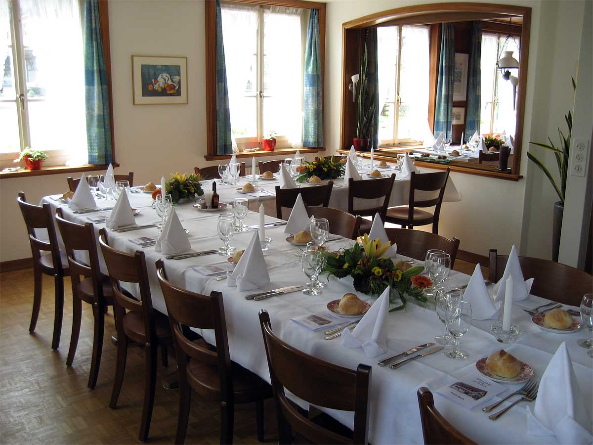 Das Restaurant bietet Platz für 30 Personen und vermittelt dank des altehrwürdigen Charmes viel Behaglichkeit. Direkt angrenzend lädt das Stübli für bis zu 25 Gäste ein; kleineren Feiern wie Geburtstage, Taufessen, Kommunion, Vereinsanlässe, Wandergruppen… Ihr seid Willkommen! Für Gruppen bis 55 Personen senken wir die Trennwand zum Säli ab und «verbinden» kurzerhand das Restaurant mit dem Stübli. Die Tafel «geschlossene Gesellschaft» schmückt dann die Eingangstüre zur Wirtschaft.